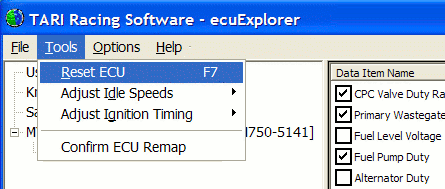 What follows is a description of resetting your Newage ECU using ecuExplorer which, at the time of writing, is distributed free by TARI Racing. This software is described in more detail in the ECU diagnostics and data logging technical article.
