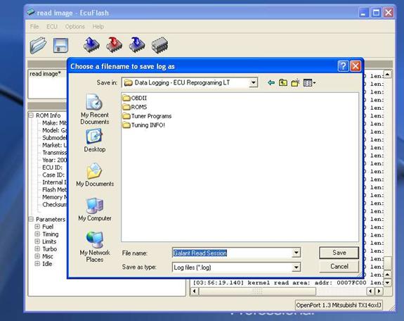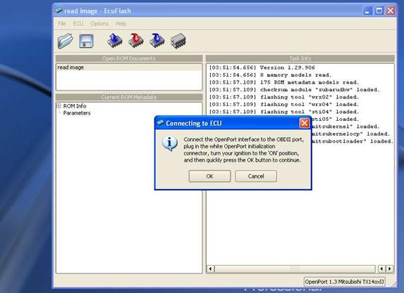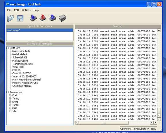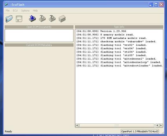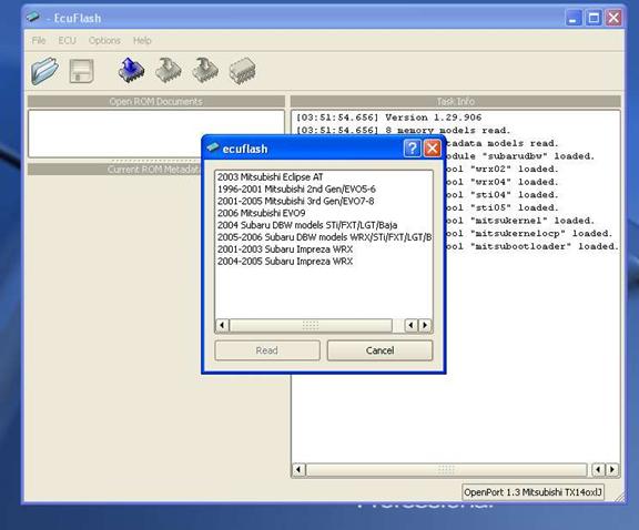 The most common 1^st^ step in learning to use your tuning software/hardware is to pull a ROM from the automobile being tuned. So lets familiarize ourselves with the software by using it a simple and safe 1^st^ run. Below is an example of the ECU Flash browser, with the hardware recognized by the OpenPort 1.3 Mitsubishi TX14oxlJ in the lower right-hand corner of the browser. (OpenPort may differ depending on model cable).