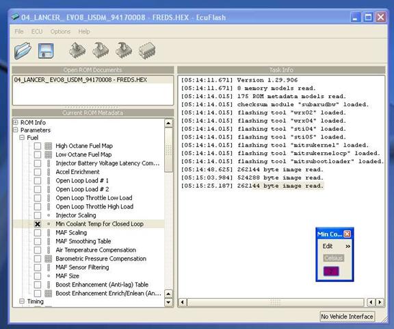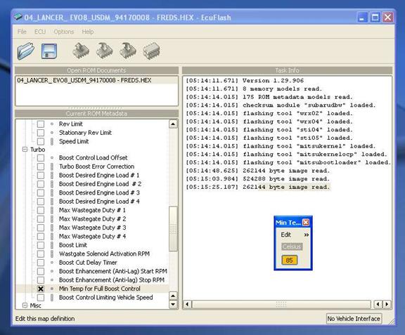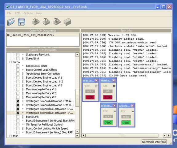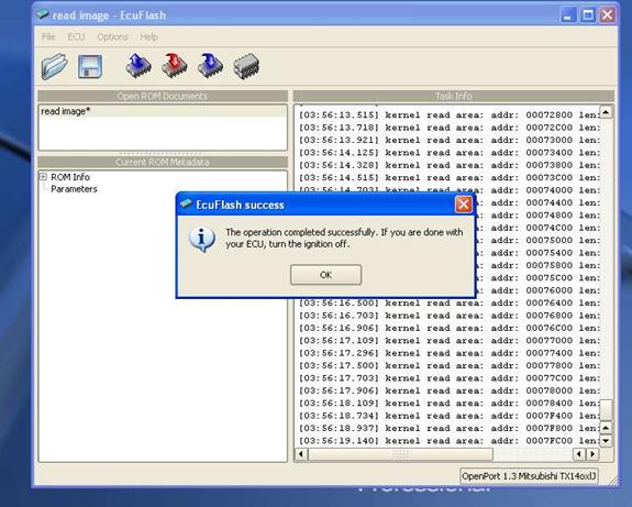 This is when you just sit back and wait patently until the entire ROM is read from the ECU. The program will scroll the memory sectors that have been read (in the Task Info window of ECU Flash browser) and when finished, ECU Flash will bing and you may now turn the ignition to off and remove your interface cables. You may also hear the fuel pump or relays click, this is completely normal.