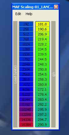 MAF (Mass Air Flow) Scaling is a set of values that correspond to an applied load range. The values represent the weight of air passing the MAF, calculated in the amount on air in grams/ per second. This is one of the tables the ECU uses to calculate injector duration/frequency during engine operation.