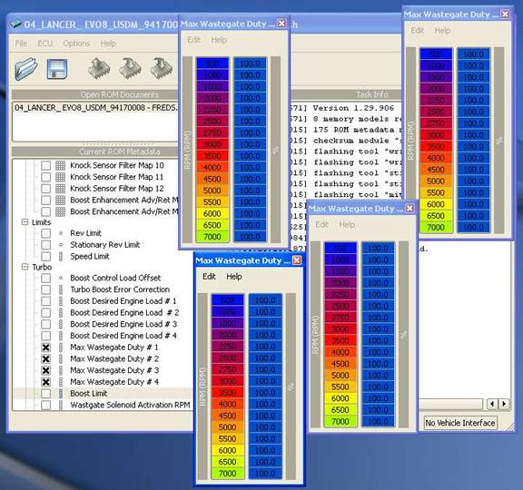 The Max Wastegate Duty Table is the amount the wastegate will open up so built up exhaust pressure does not cause boost creep. This can be change to raise the turbo spool time and to a certain extent, increase turbo output. Multiple tables are used in the case that boost error is detected, although this particular ROM is set to 100% Wastegate duty.
