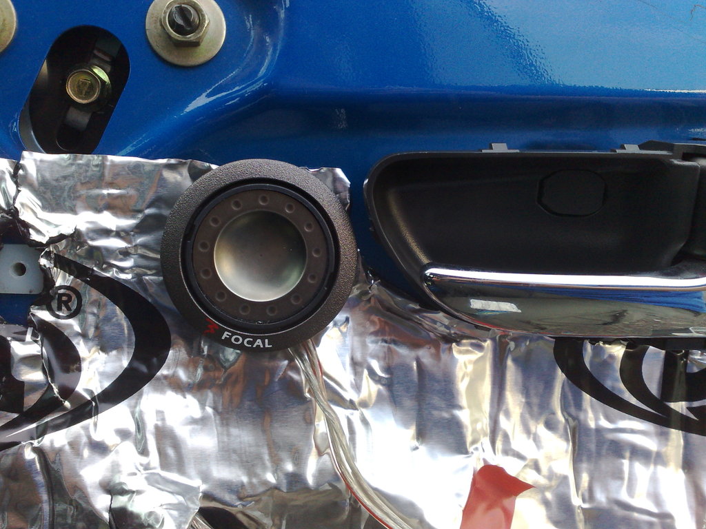 To mount the tweeter I simply used some double sided sticky pads and to get the location right I got one of the new Hawkeye door surrounds, held the tweeter behind the mesh in the surround and offered up the surround to the door handle before pressing the tweeter down into it’s new location.