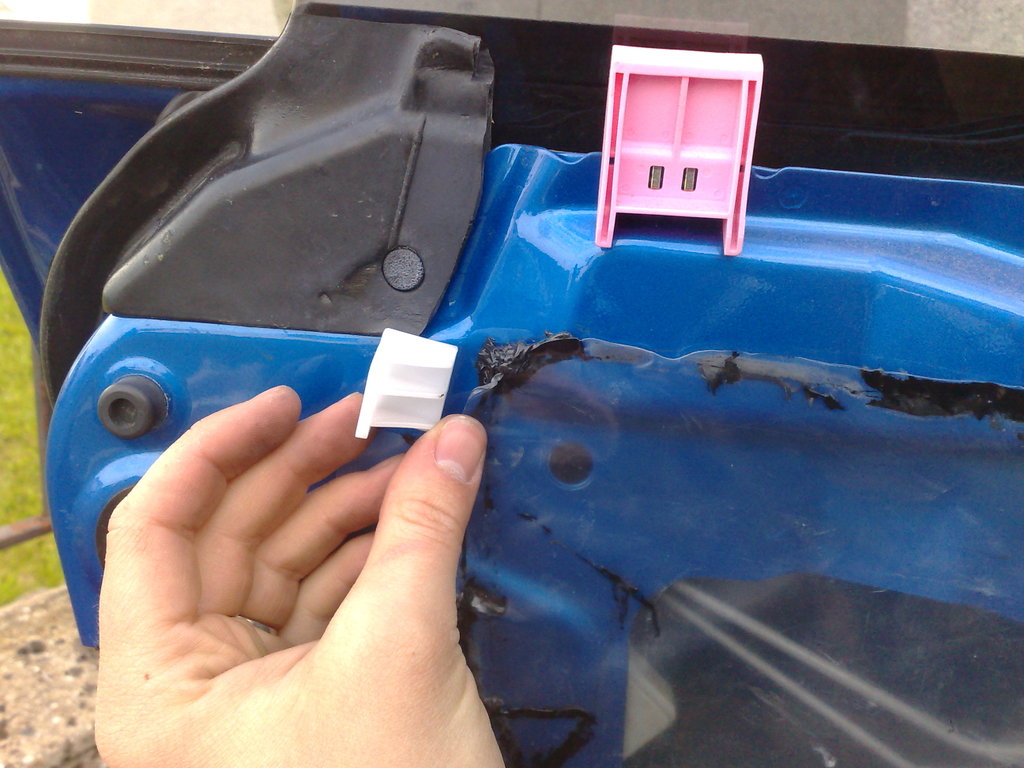 Before progressing on with the door card I checked the back of the new one with the old to compare the mounting locations of all the plastic poppers used to keep the door card in place. As a result I found that one of them, shown below, had to be removed as there was no corresponding hole in the door – or if there was it was underneath the Dynamat!