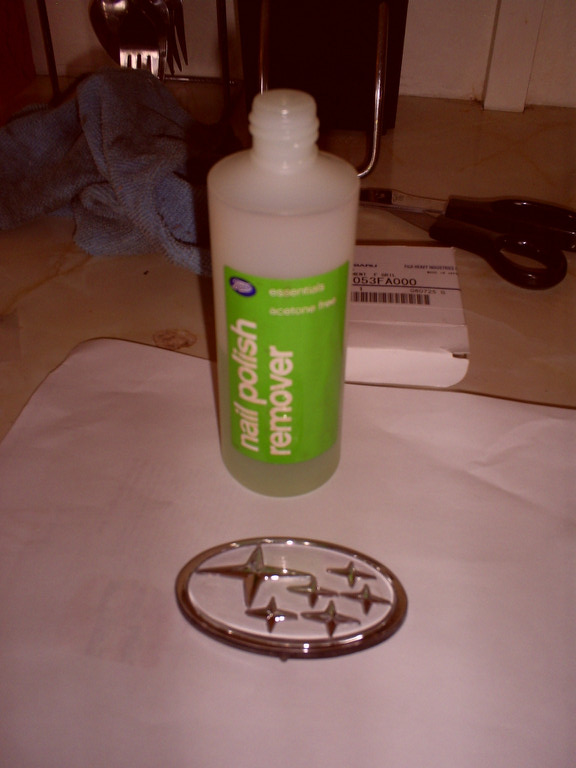 3. Take old badge (or buy a new shiny one :P) remove black from the back of the badge using nail varnish remover, leaving it see through with the silver stars. Spray a thin coat of white enamel gloss and glue to front of grille: