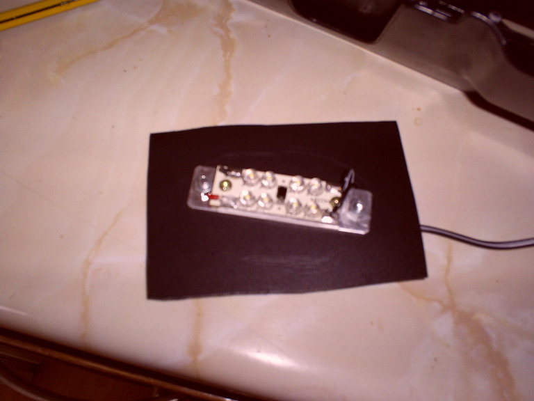 2. Cut out the back of an old DVD or CD case (7cm x 10cm) mount LED bank and glue to back of grille