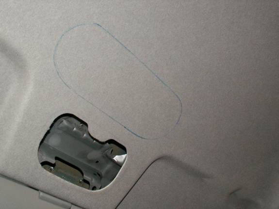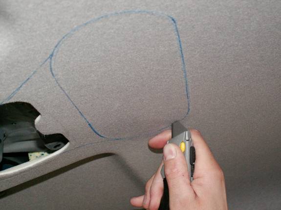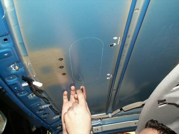 Tape a large plastic bag to the inside of the roof surrounding the hole to be cut. This will catch any debris that will drop inside of the car.