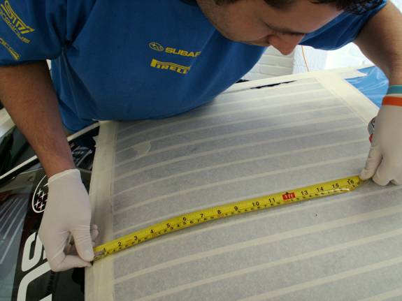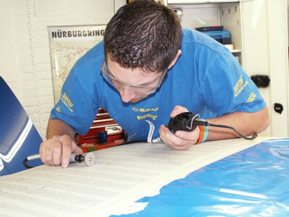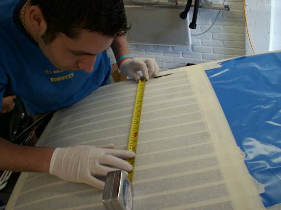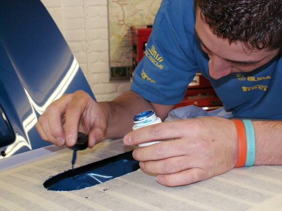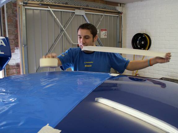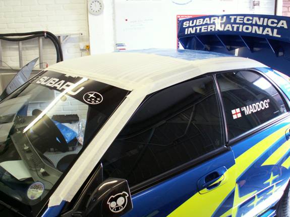 While the roof is still masked, paint the fresh cut edge with some touch in paint. The rubber seal does have sealant already in it that means this is not strictly necessary. However, we had some genuine WR blue paint so did it properly.