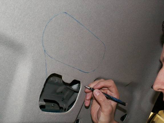 With the trim in place, use a ballpoint pen to carefully trace onto the lining.