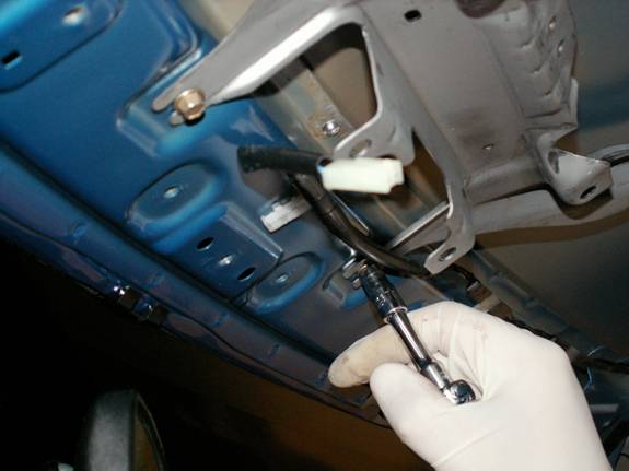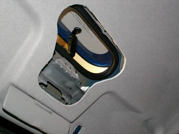 You will be greeted with the stock map light bracket. This is attached with three spot welds and three spots of RTV sealant. These spot welds are clearly visible and require drilling out using a special spot weld removing drill.