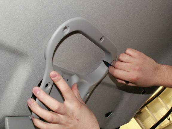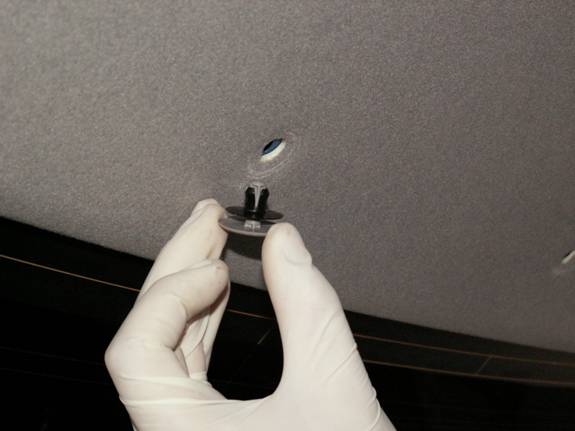 Ensure the headlining is square and loosely attach the front centre sun visor. This is only fitted to hold the headlining in place in order for it to be trimmed.