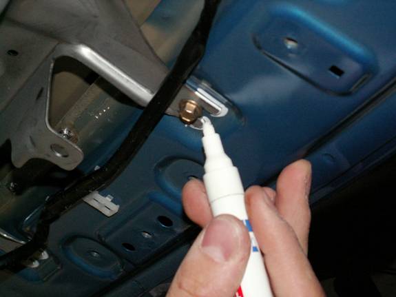 Now you are happy with the bracket placement. Carefully centre punch the four holes for the hinge studs. Be certain to get these centred correctly, you have very little margin for error here.