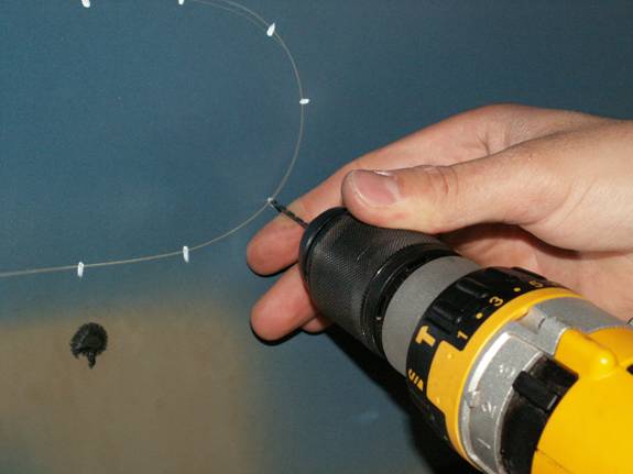 Using a small pilot drill, drill holes around your scribed outline. These will be used to locate your template on the outside.