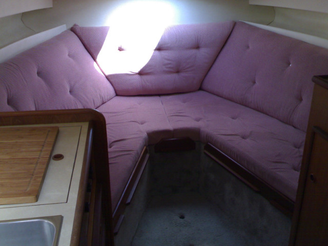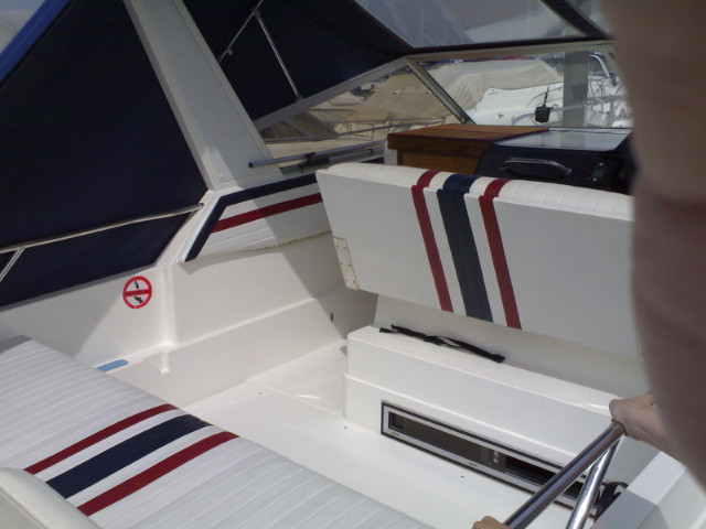 HE-J from the front at moorings in the marina. | ...and another from the other side. | Cockpit with drivers seat in reversed position. Space for six adults round the cockpit table. | Cockpit with drivers seat in normal position and cockpit table stowed away. |