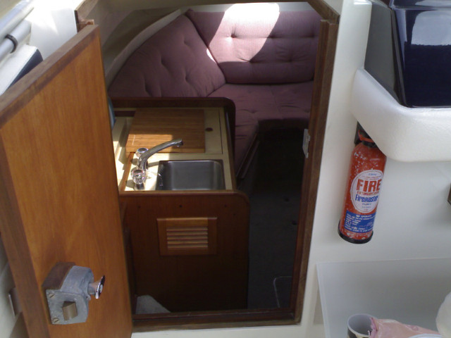 View from cockpit down into the galley. | In the saloon, front view showing large vee-berth which turns into one of the double berths. Cockpit table can be fitted here also. | In the saloon looking back showing flat panel TV, large locker, door to the heads and rear midship double cabin. | Sink, worktop, cooker, grill, fridge and storage area. |