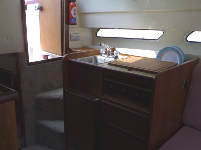 View from cockpit down into the galley. | In the saloon, front view showing large vee-berth which turns into one of the double berths. Cockpit table can be fitted here also. | In the saloon looking back showing flat panel TV, large locker, door to the heads and rear midship double cabin. | Sink, worktop, cooker, grill, fridge and storage area. |