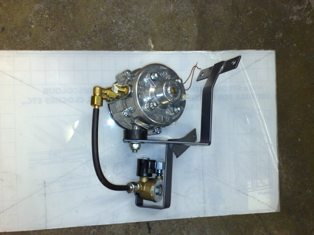 This was probably the most difficult part to fit. A bracket had been supplied with the kit that is used to mount the vaporiser but this wasn't suitable for the location I had in mind. The washer bottle had now been removed from the inner wing so the space was available for the unit although it still needed to be mounted in a way that would allow for all of it's connections. The unit would have a liquid LPG supply, 2 coolant hoses running from the car, 2 gas outlet pipes for the injectors, 2 vacuum/pressure pipes and the electrical connection for the temp sensor. The only way forward was to develop a new bracket that could be used to mount the vaporiser. During this process it was decided that the shut off valve that goes between the LPG pipe and vaporiser would in some way be mounted on the same bracket. The connecting pipe between the shut off valve and the vaporiser is the only one that is made from copper. The copper pipe was used as the fixings at either end are shorter than those for the flexi pipe.