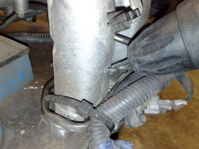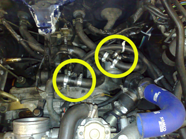 The next step was to connect the coolant hoses from the cars heating system. The vaporiser needs these feeds in order to stop the liquid LPG from freezing when it turns to gas. This was a simple case of removing the intercooler and making the connections shown.