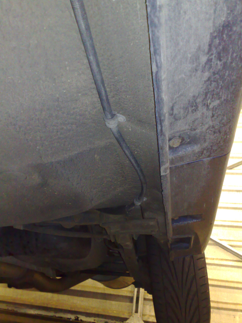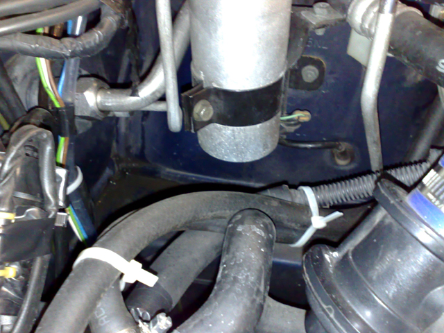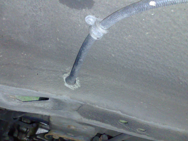 The routing of the pipeline was first attempted using the 8mm copper pipe that was originally supplied with the kit. I attempted to route the pipe out of the spare wheel well and then between the floor pan and rear cross member and then down the NS of the car to the vaporiser. At best this was an exercise in skin removal and was aborted within an hour or so. After obtaining some 8mm flexi pipe from Tinleytech I routed the pipe (as shown in the pics) down the NS of the car. I used some rubber heater hose to protect the pipe where it was routed through the cross member and some rubber grommets for where it passes through the 2 holes I drilled in the front chassis rail. Where the pipe enters the engine bay I have used cable ties to fasten the pipe to the air-con pipes before reaching the shut off valve and vaporiser.