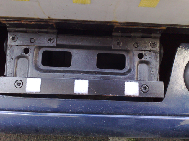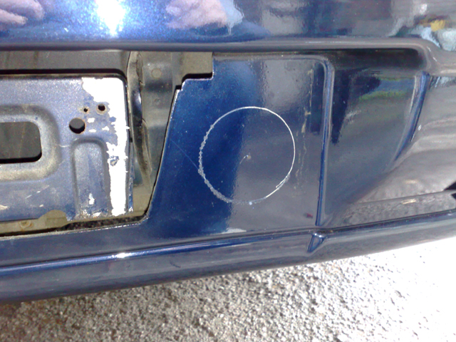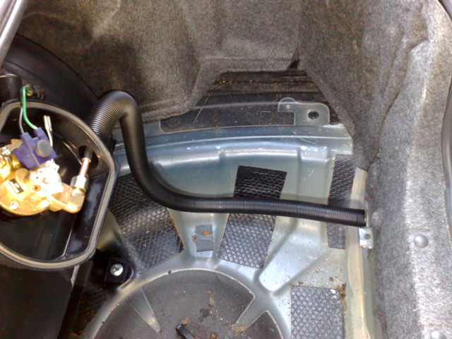 The filler mechanism and cap were located behind a hinged number plate. The hole was first marked out and then cut by drilling small holes all the way round before being filed. I didn't have a hole saw of the right size and this method worked nicely. The unit is fitted in place using 6 screws and a plastic cap on the rear of the filler. The 8mm flexi pipe from the filler runs behind the bumper and then into the vent tube before reaching the gastight box and multivalve.