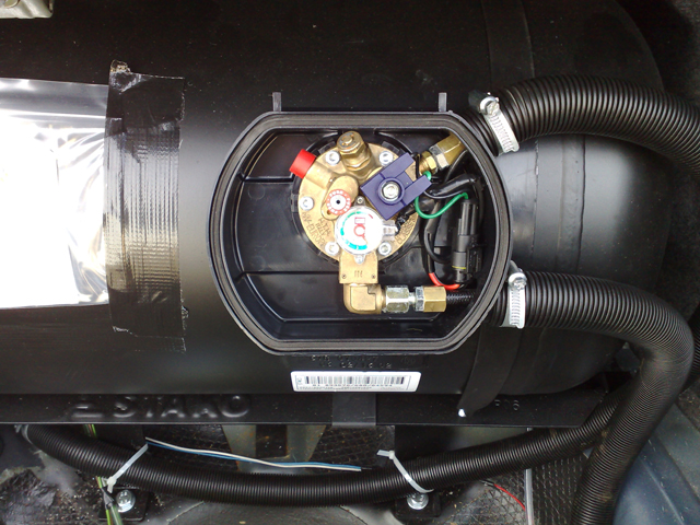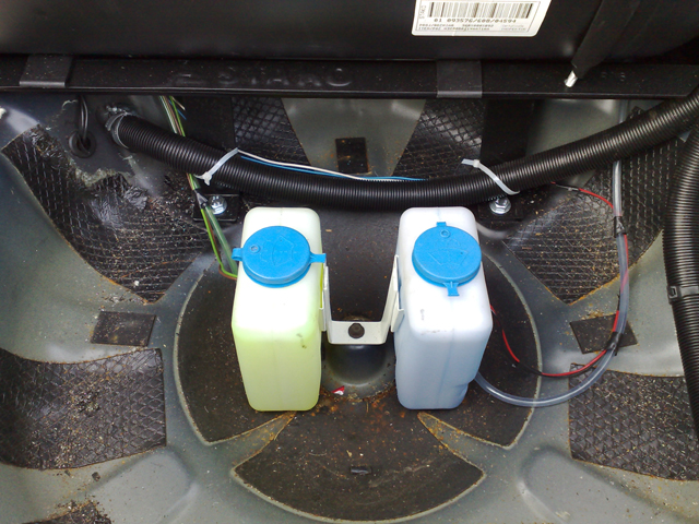 The tank was then positioned and fastened down using the straps supplied. The multivalve, gastight box and vent tubes were fitted and secured. The multivalve has the filler valve, fuel level sensor, tank solenoid valve and emergency vent valve all merged into one device. The gastight box allows the venting of gas in the event of a leak, through the vent tubes and then outside of the vehicle. All gas pipes and wiring are routed through the vent tubes. The washer bottles are shown with the right hand side feeding the rear and the other feeding the front.