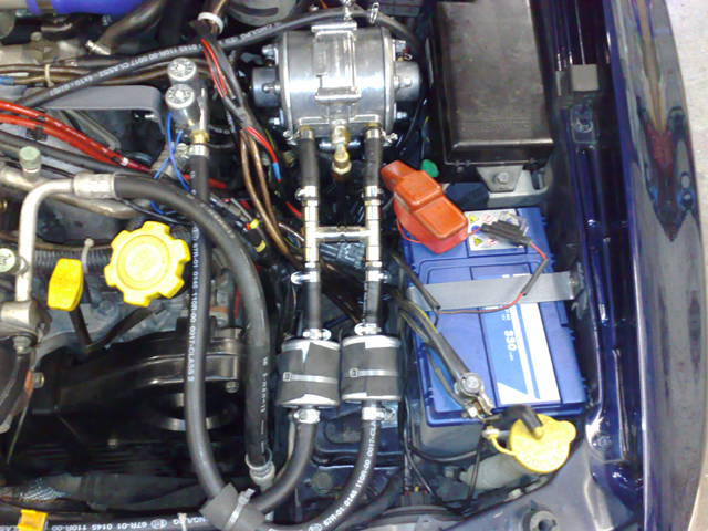 After fitting the vaporiser it was clear that the original Subaru battery would interfere with the gas pipes leading to the injectors. An attempt was made to route the gas pipes around the battery although the bends were too tight and this idea was discarded. This was a consideration when first thinking about the location for the vaporiser.