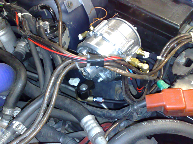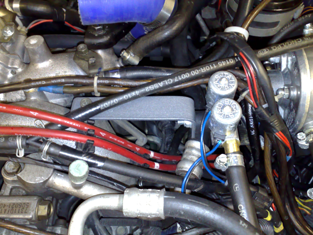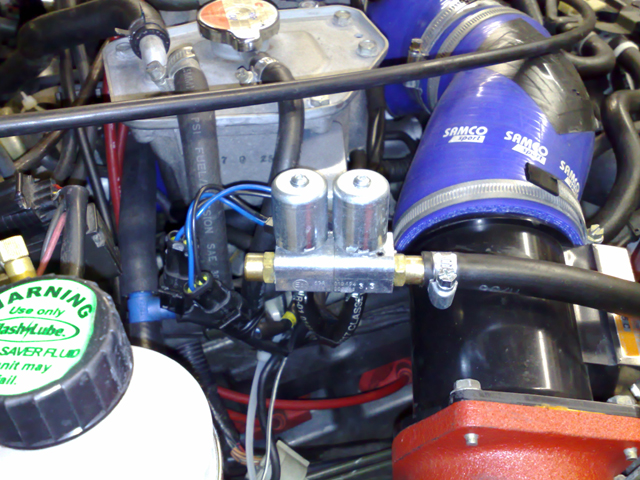 The H section then feeds into 2 filters, one for each bank of injectors, and then out to the injectors. The injectors are mounted on fabricated brackets that fasten to the manifold via rubber mounts. The long section of gas hose that feeds the OS bank is fastened to the power steering fluid pipe that runs along the top of the radiator fan shroud.