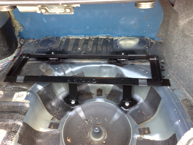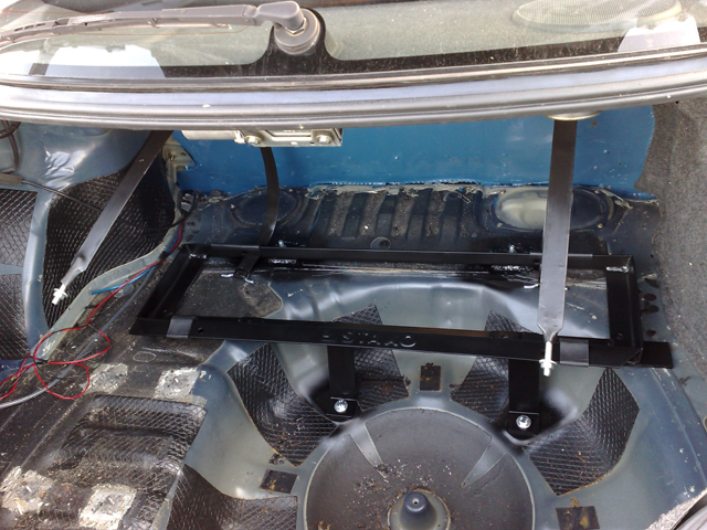 I started at the rear of the car with the tank and filler mechanism. The tank cradle was placed in the boot space and moved around to find the best location. The Impreza has access panels to the fuel pump and sender unit that still need to be available. Moving the cradle forward of these allowed it to sit level but created a couple of problems. The frame wasn't wide enough to sit on the chassis rails and was over the spare wheel well eliminating the possibility of keeping a spare wheel in the car. For the last 4 years of ownership I had never had the spare wheel in the boot anyway so it was decided to lose the spare wheel altogether. This would allow space for the washer bottle relocation and for fabricating extra mounting points for the tank frame. The code of practice states that for my size of tank and the type of frame being used 4 mounting points should be used. The pictures below detail the process including showing the extra framework fabricated to make the frame fit. I also welded in some captive plates/bolts to hold the rear of the frame as this sits directly over the rear cross member. Spreader plates are used under the car as per the code of practice.