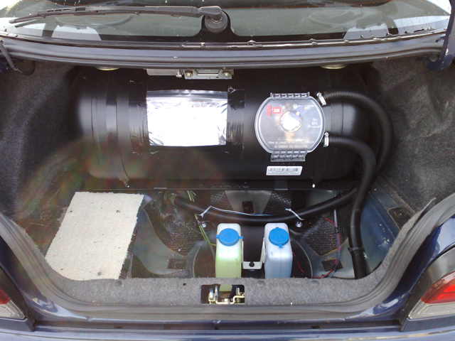 The vaporiser unit fits in nicely and there is still space for the shut off valve that receives the gas line from the tank. The washer bottle would need relocating to the boot. This is shown later.